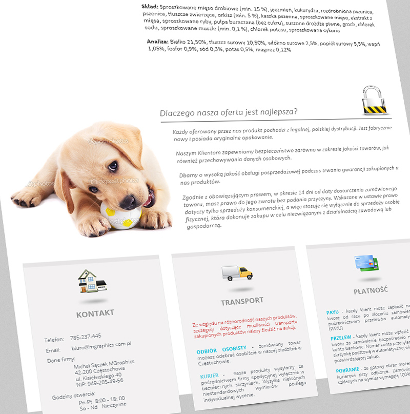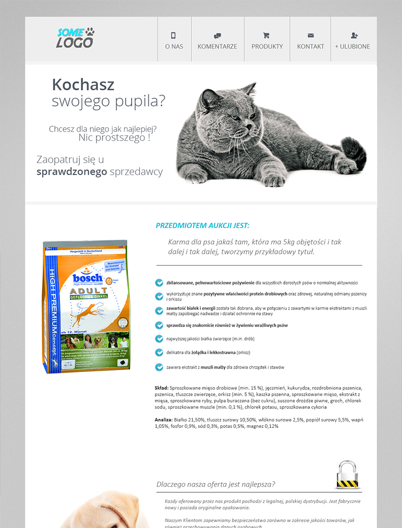 Realizacja szablonu allegro dla firmy specjalizującej się w sprzedaży produktów dla zwierząt, między innymi karmy dla psów, kotów oraz akcesoria.